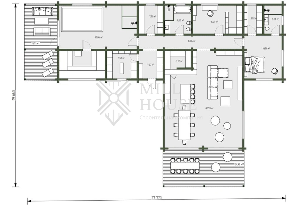 - Общая площадь крытых террас 64,03 м²: место для утреннего кофе и вечерних посиделок на свежем воздухе