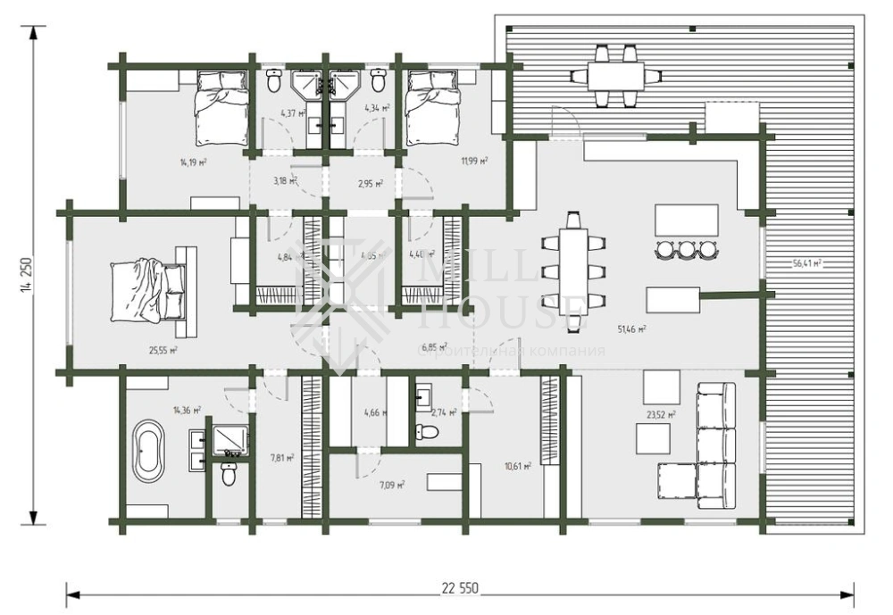 - Крытая терраса площадью 57,23 м², где можно наслаждаться природой и свежим воздухом вне зависимости от погоды