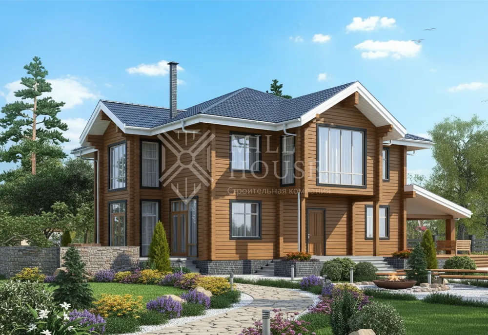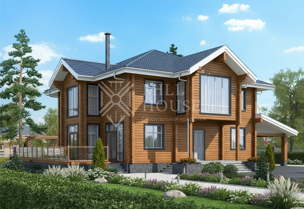 Это двухэтажный деревянный коттедж в современном стиле с общей площадью 360 м², предназначенный для большой семьи. Он сочетает просторные жилые зоны, террасы для отдыха и удобные санузлы.