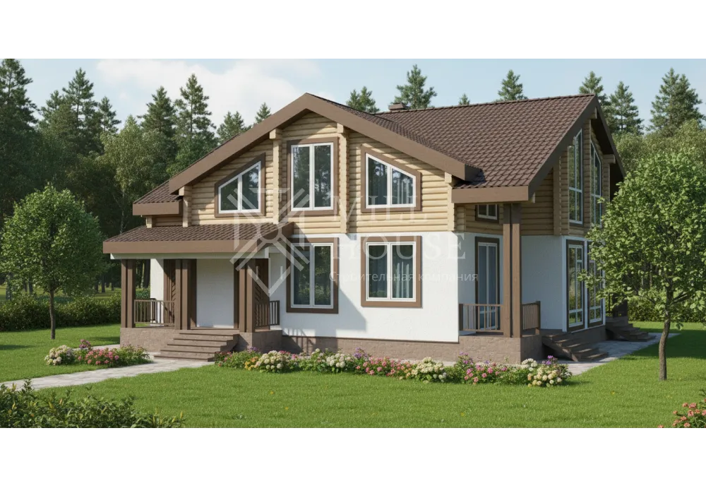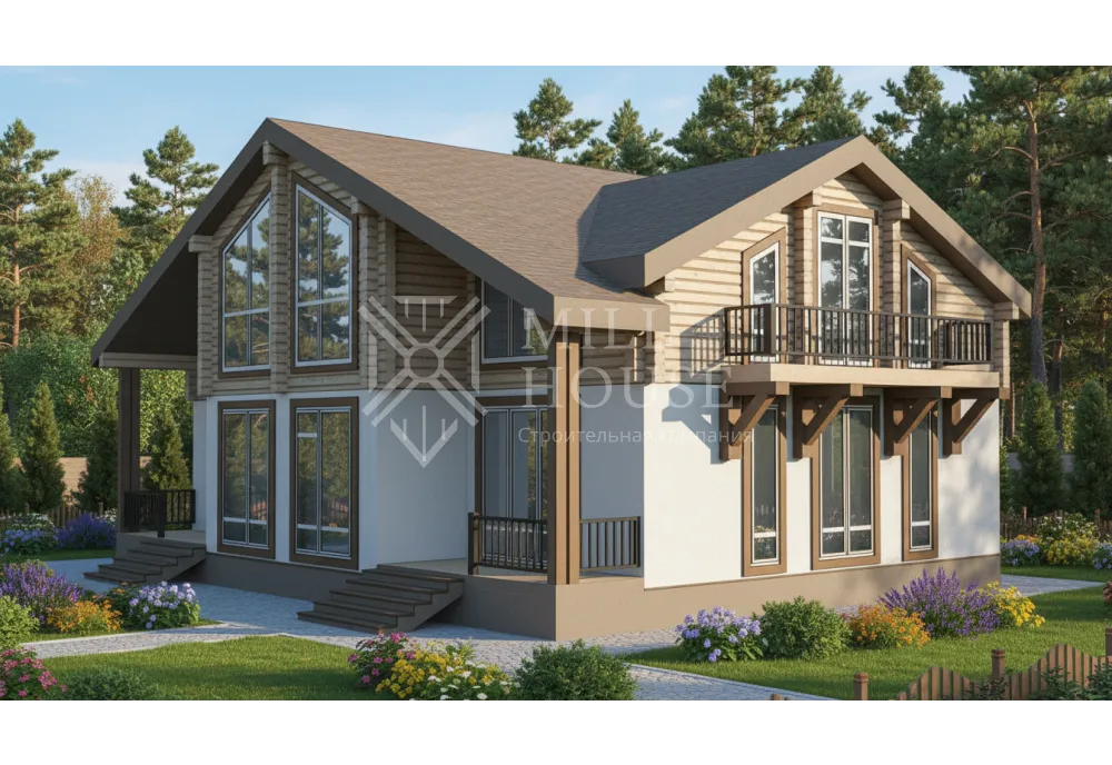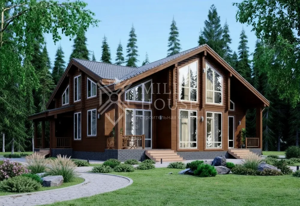 Это современный двухэтажный дом из бревна в скандинавском стиле с большими панорамными окнами и верандой, окруженный лесом. Планировка акцентирует внимание на просторных общих зонах и приватных спальнях, идеальна для семьи из 5–7 человек.