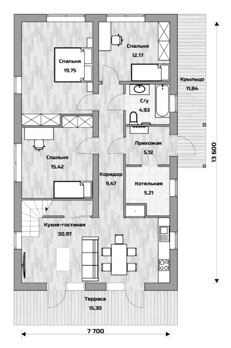 - Жизнь на свежем воздухе: Просторная терраса станет вашим любимым местом для семейных обедов, утреннего кофе или просто отдыха на природе, являясь естественным продолжением вашего дома.