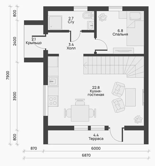 Оцените элегантный двухэтажный каркасный дом, выполненный в архитектурном стиле Барнхаус. Этот дом, с габаритами 7,9 на 6,9 метров, выделяется тщательно разработанной планировкой, где каждый квадратный метр используется с максимальной пользой.