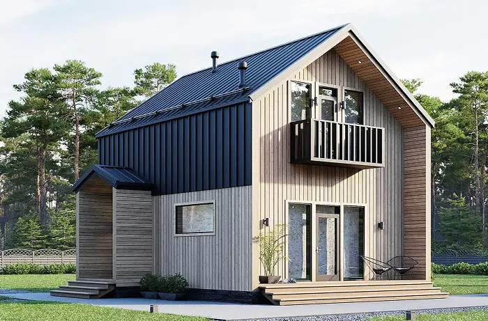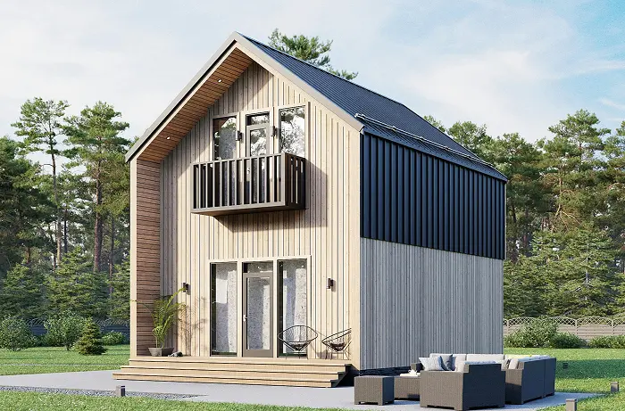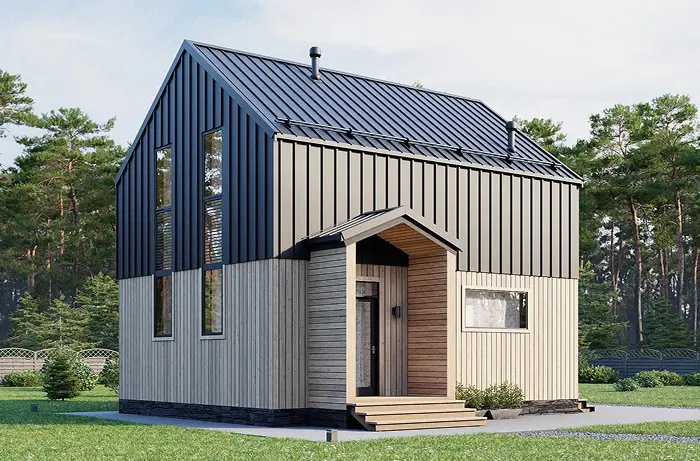 Оцените элегантный двухэтажный каркасный дом, выполненный в архитектурном стиле Барнхаус. Этот дом, с габаритами 7,9 на 6,9 метров, выделяется тщательно разработанной планировкой, где каждый квадратный метр используется с максимальной пользой.