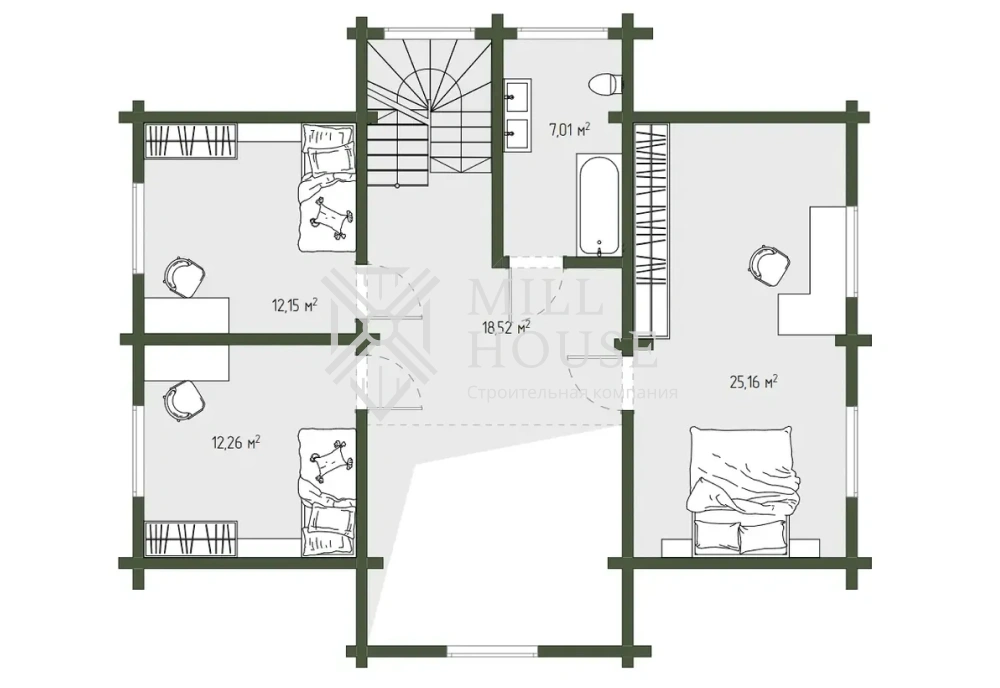 - Продуманная двухэтажная планировка обеспечивает разделение зон отдыха и отдыхающих
