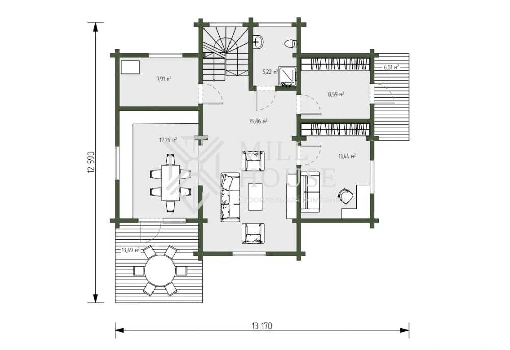 - Крытая терраса площадью 19,79 м² служит отличным местом для отдыха, уютных посиделок и наслаждения природой