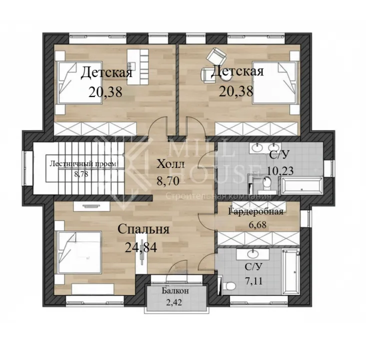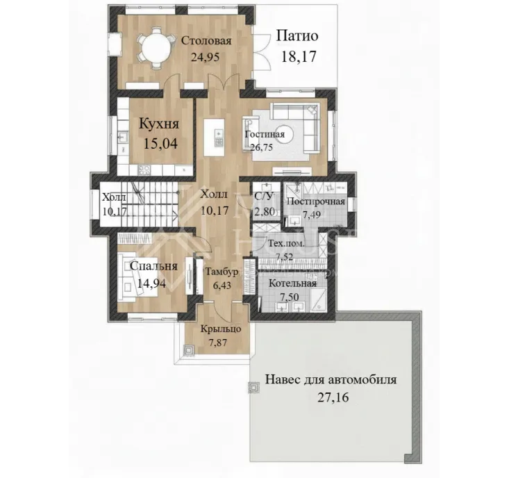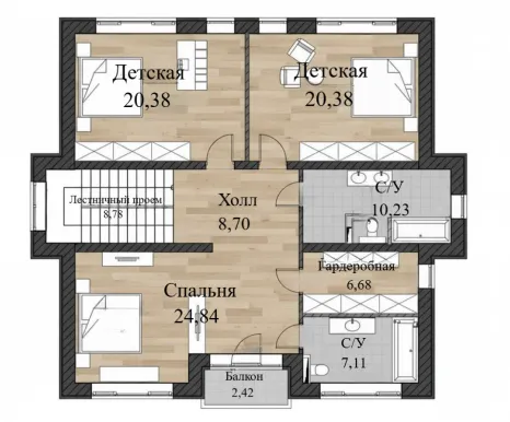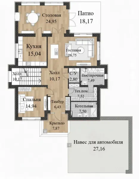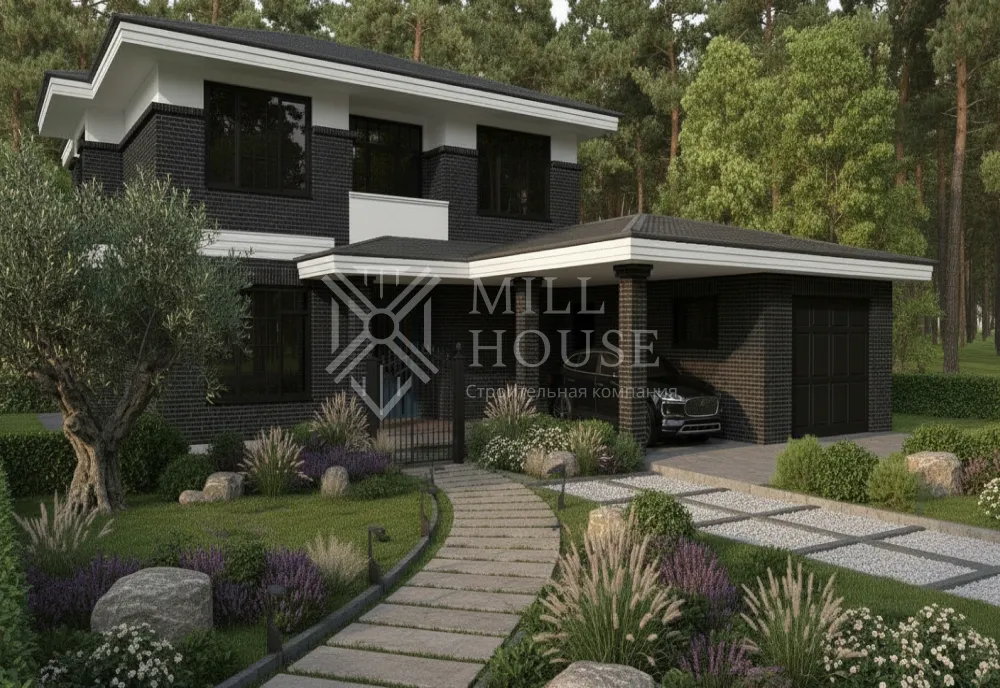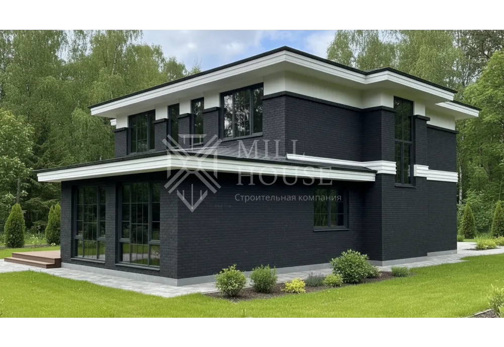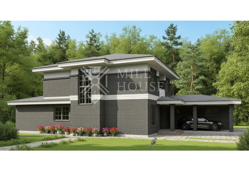 Это современный двухэтажный дом с общей площадью 325 м², предназначенный для семьи среднего размера. С просторными комнатами, включая спальни, кухню-гостиную, санузлы и кабинет, он обеспечивает комфортное проживание с акцентом на функциональность, естественное освещение и удобную планировку. Дом сочетает минималистичный дизайн с практическими зонами для работы и отдыха.
