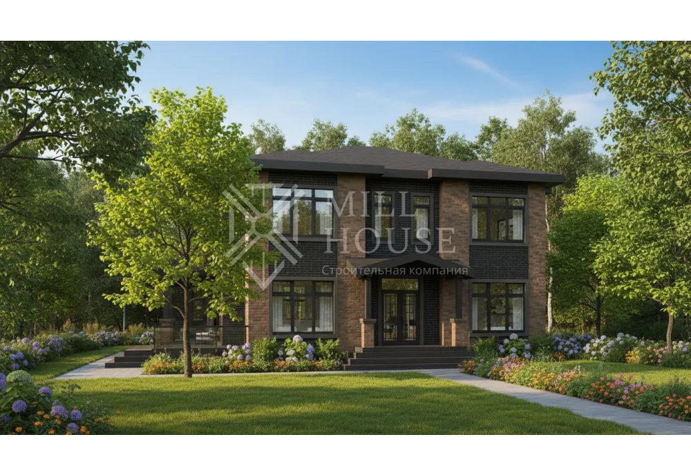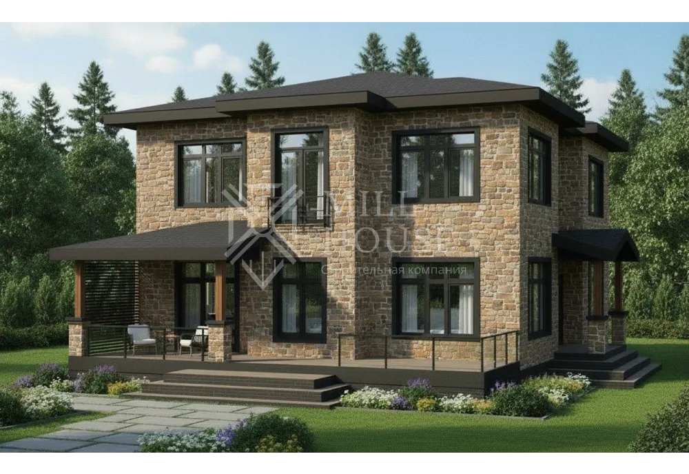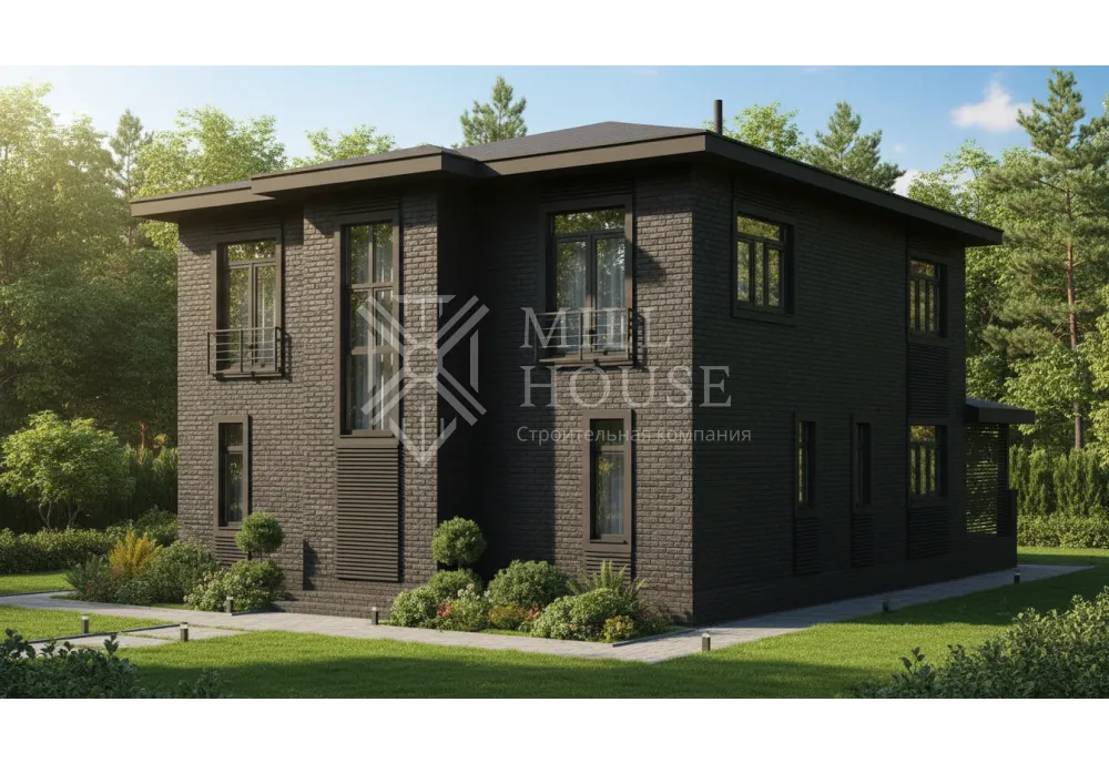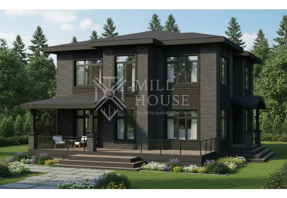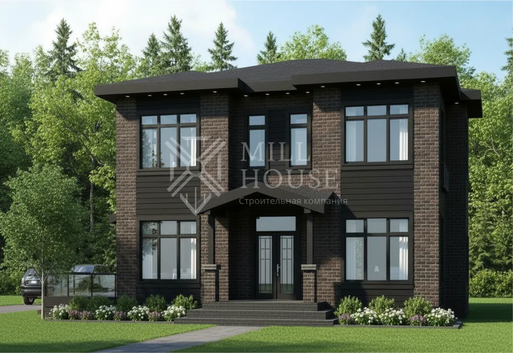 Этот двухэтажный дом в современном стиле сочетает элегантность и практичность. Большие панорамные окна из энергоэффективного стекла пропускают естественный свет, обеспечивая отличную видимость и теплоизоляцию. Планировка дома разделена на два этажа, обеспечивая удобство для семьи из 4–6 человек.