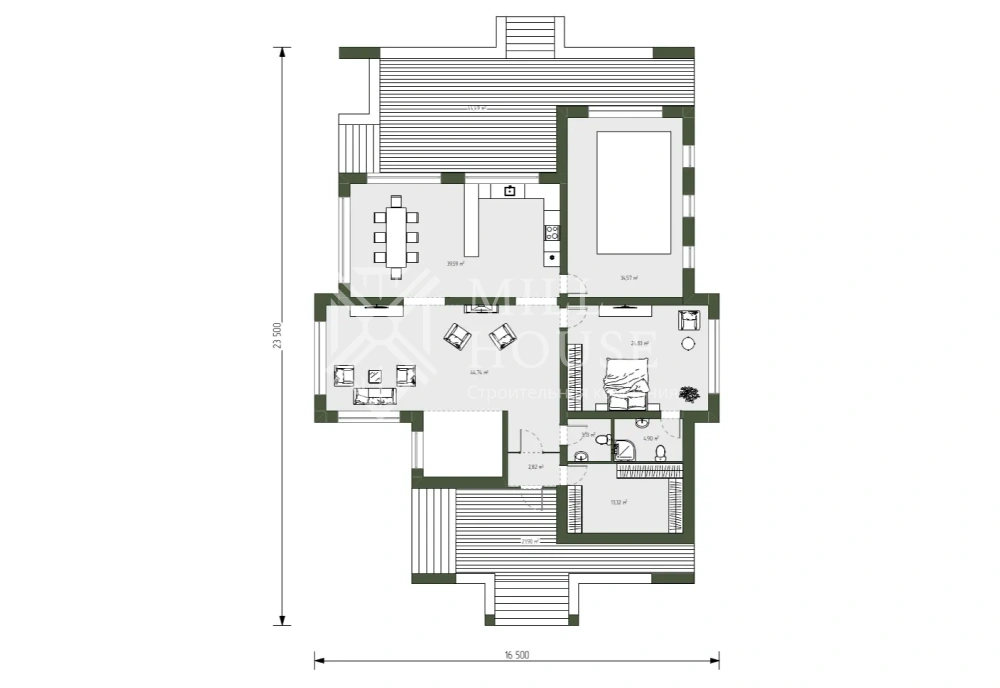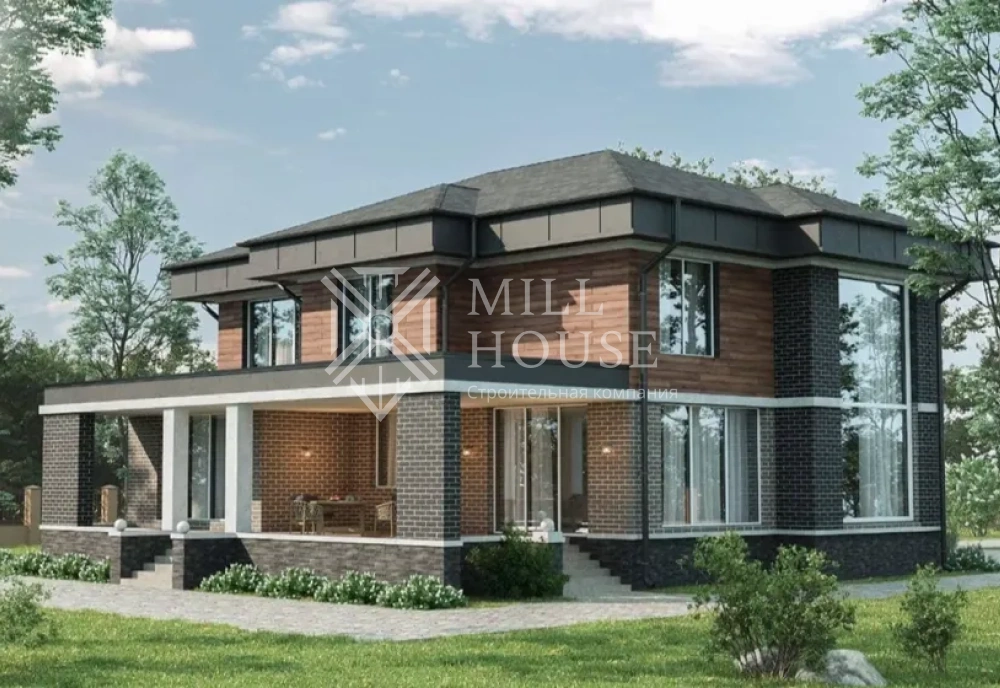 Фасад дома выполнен с использованием современных материалов: сочетание деревянных панелей и клинкерного кирпича двух видов и цветов — для стен и цоколя. Такой дизайн подчеркивает стильность, солидность и природную гармонию общего образа.