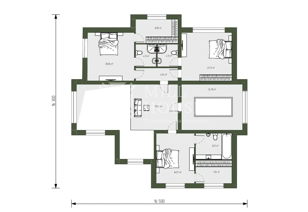 Второй этаж характеризуется тремя жилыми комнатами: две из них имеют собственные гардеробные и личные санузлы, что повышает уровень комфорта и приватности. Центром этажного пространства является просторный холл, объединяющий все комнаты и дающий возможность организовать различные зоны отдыха или работы. Из холла есть доступ к бильярдной — ещё одной привлекательной зоне для развлечений.