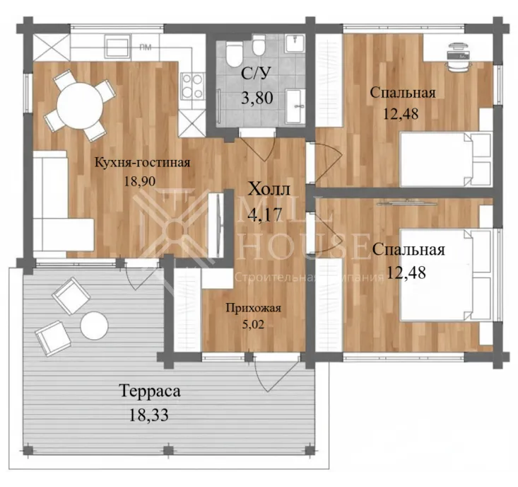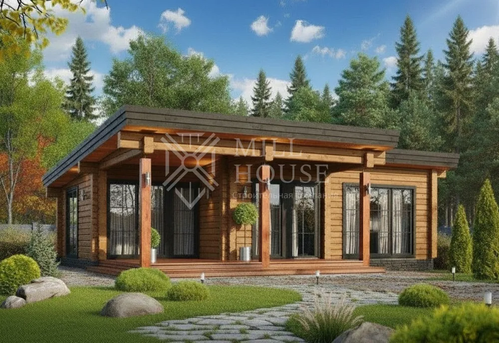 Это компактный одноэтажный дом из бревна в минималистичном стиле с террасой. Идеален для пары или небольшой семьи из 2–3 человек, с акцентом на уют и природу.