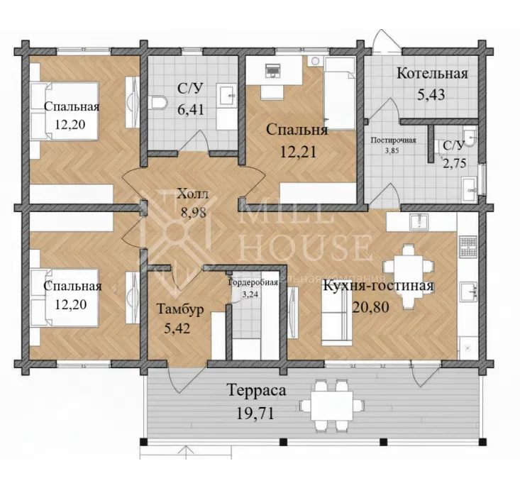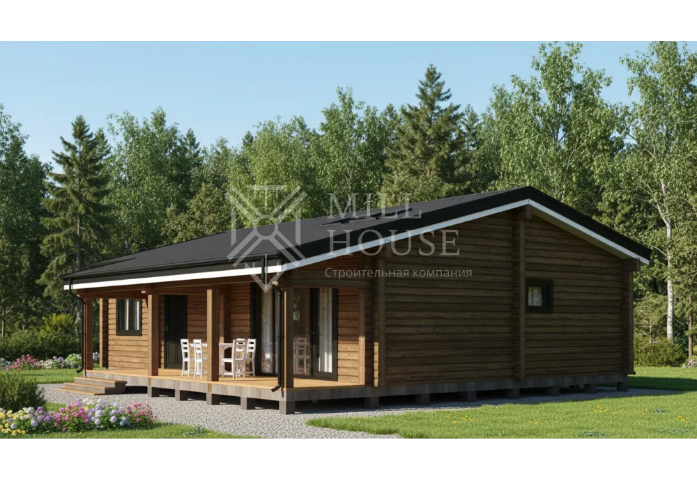 Это компактный одноэтажный дом из бревна в современном стиле с большой террасой. Идеален для семьи из 3–4 человек, с просторной кухней и несколькими спальнями.