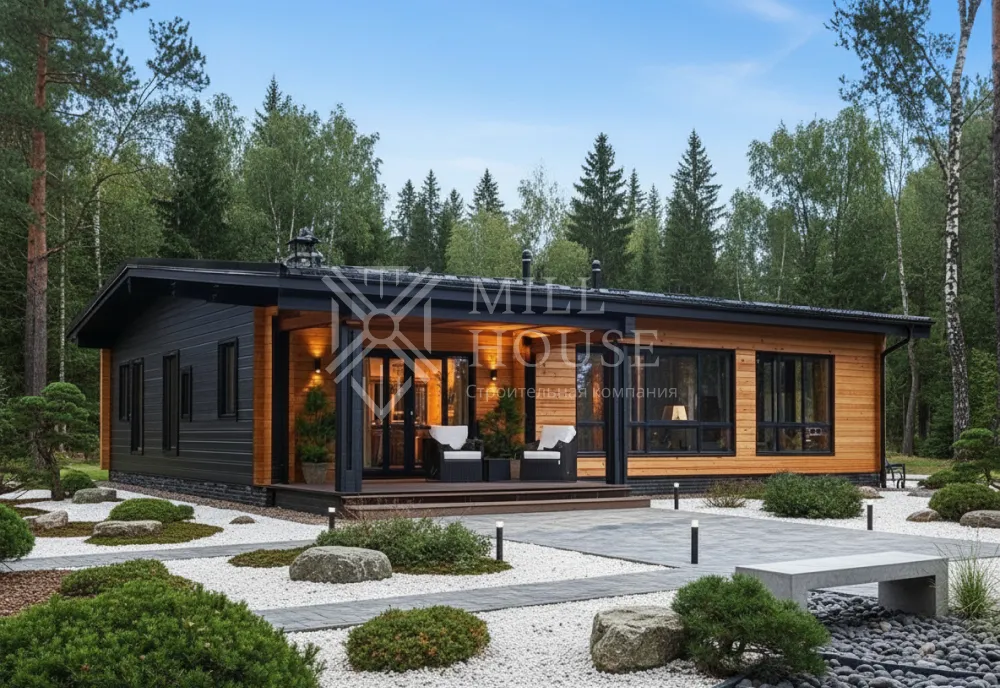 Это компактный одноэтажный деревянный дом в скандинавском стиле с общей площадью 110 м², спроектированный для гармоничной жизни. С панорамным остеклением, уютной террасой и зонами для релакса, он сочетает минимализм и функциональность, идеален для пары или небольшой семьи.