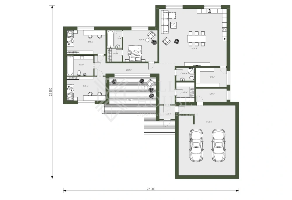 Дополнительно дом оборудован гардеробной, ванными комнатами и санузлом с душевой кабиной, а также важными техническими помещениями: кладовой, котельной и гаражом на два автомобиля — всё для максимального удобства жителей.