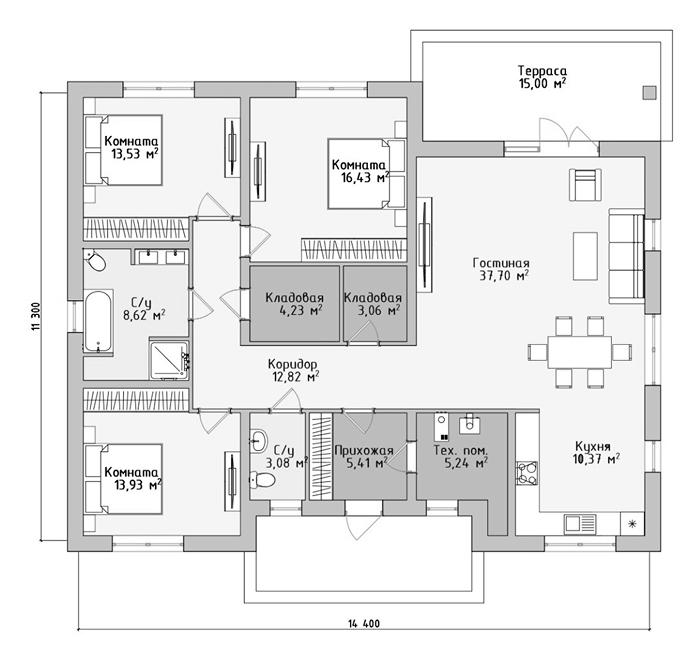 Проект одноэтажного дома из камня и кирпича представляет собой идеальное сочетание надежности каменного дома и теплого уюта современной загородной жизни. Одноэтажный коттедж размерами 11,3 x 14,4 метра прекрасно подходит для семьи среднего размера, предлагая тщательно продуманную планировку и комфорт в каждой детали.