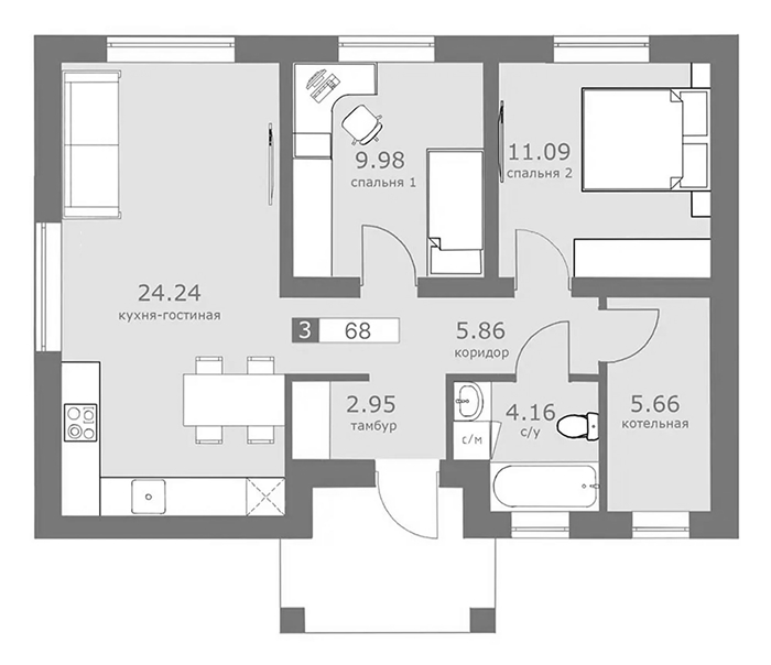 Пространство для жизни и отдыха: Две просторные спальни обеспечат вам полноценный, восстанавливающий сон. А ванная комната, продуманная до мелочей, с возможностью выбора между ванной и душем, станет вашим личным спа-салоном.