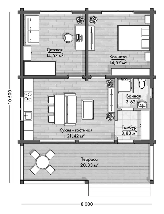 Этот современный каркасный дом сочетает в себе компактность, функциональность и уют. Площадь застройки составляет 10,5 × 8 метров, что делает его идеальным решением для небольшой семьи, дачного отдыха или постоянного проживания за городом.