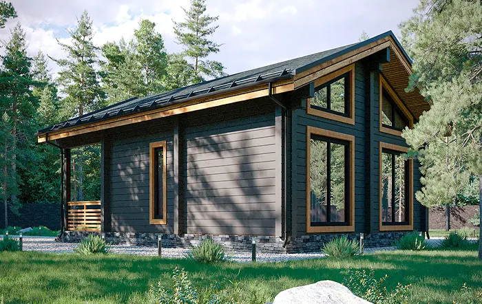 Этот современный каркасный дом сочетает в себе компактность, функциональность и уют. Площадь застройки составляет 10,5 × 8 метров, что делает его идеальным решением для небольшой семьи, дачного отдыха или постоянного проживания за городом.