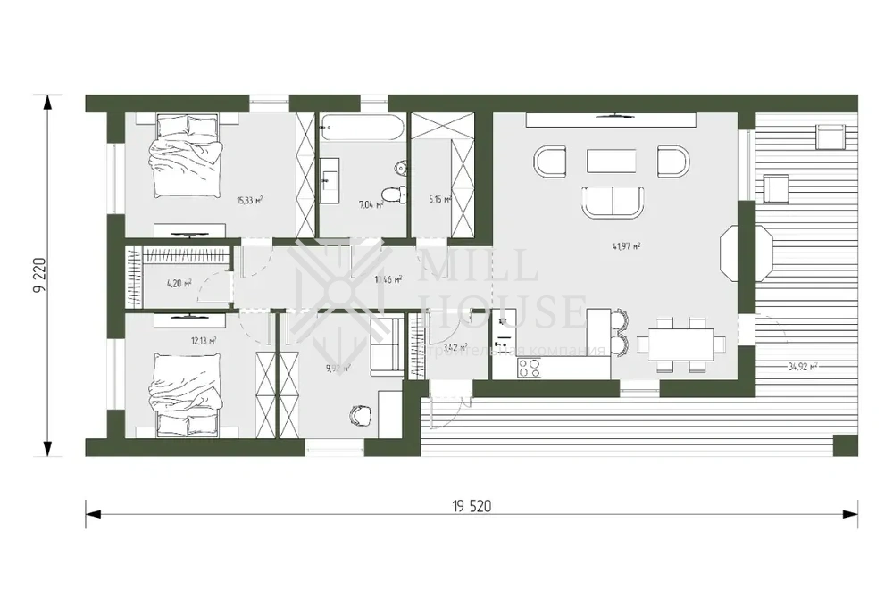 Терраса площадью 33,87 м² идеально подходит для семейных встреч и отдыха на свежем воздухе.