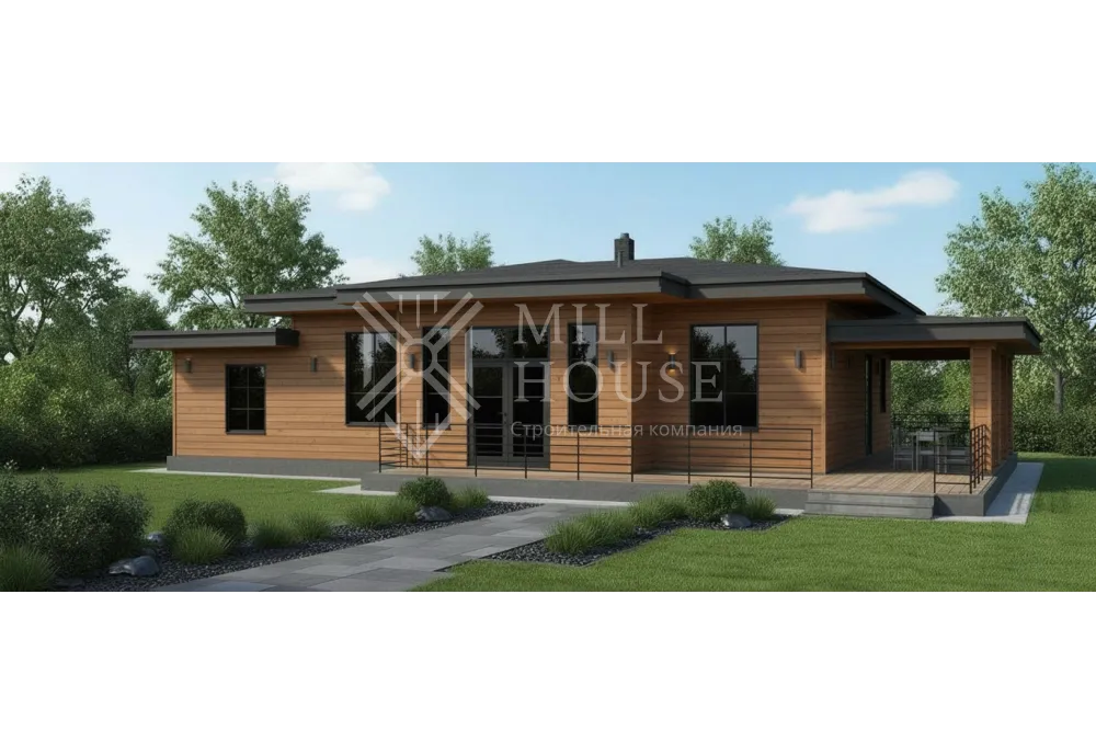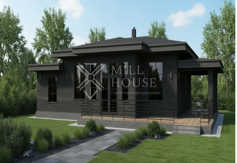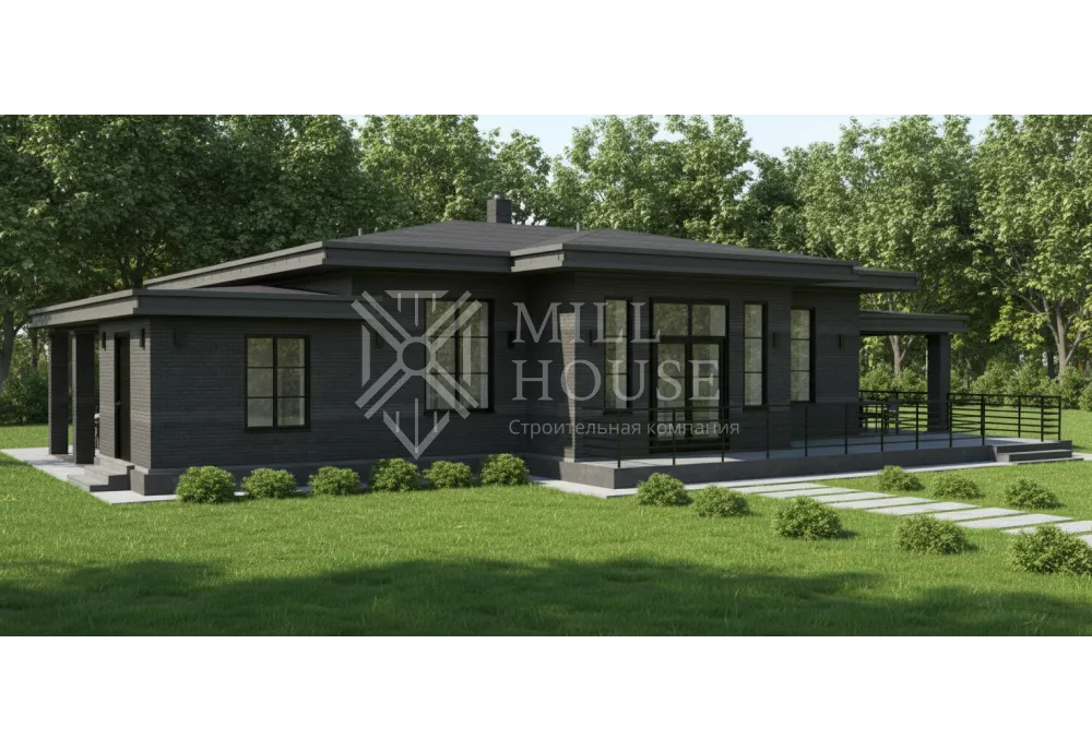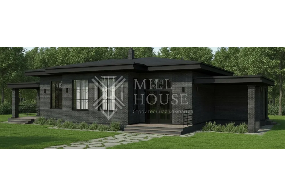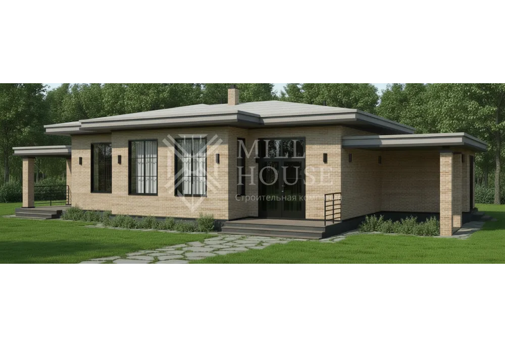Это стильный одноэтажный дом в современном дизайне с фасадом из камня и большими окнами, подходящий для семьи из 4–5 человек. Планировка включает просторную кухню-гостиную и уютные спальни с доступом к террасе.